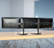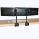 Quad monitor Freestanding mount clear up desk space by consolidating two monitors on a single stand in a horizontally stacked array. 2004MSFP is made of high-grade steel and aluminum and is designed to hold most LCD monitors from up to 32" weighing up to 17.6 lbs each. Features include integrated cable management for hiding and protecting cords, and open-top slots at the top of the mounting bracket to make attaching your monitors incredibly easy. Monitors are height adjustable and every joint is able to be tightened so you can adjust exactly how fluid/stationary you want everything to be.